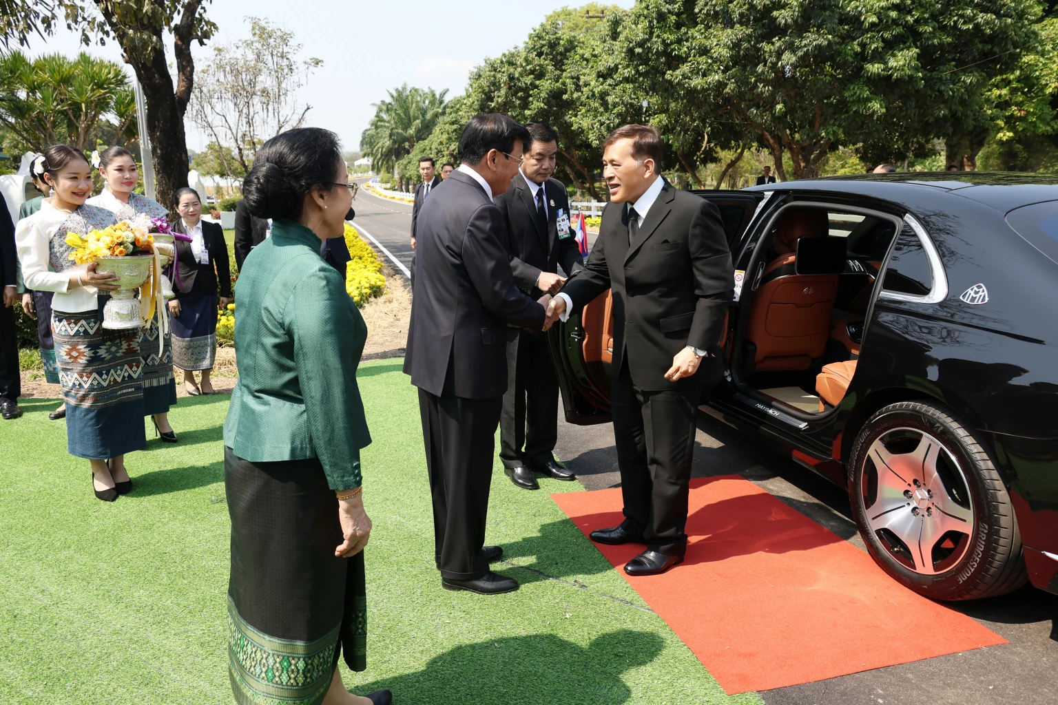 Upon arrival, Their Majesties were welcomed by Lao President Thongloun Sisoulith and his spouse, Naly Sisoulith, along with the Lao Minister of Agriculture and Environment and his spouse, the Minister attached to the Presidential Office, the head of the Huayxone-Huayxua Agricultural Development and Service Centre (Kilometre 22), and the Secretary-General of the Special Committee for Coordination of Royal Projects.