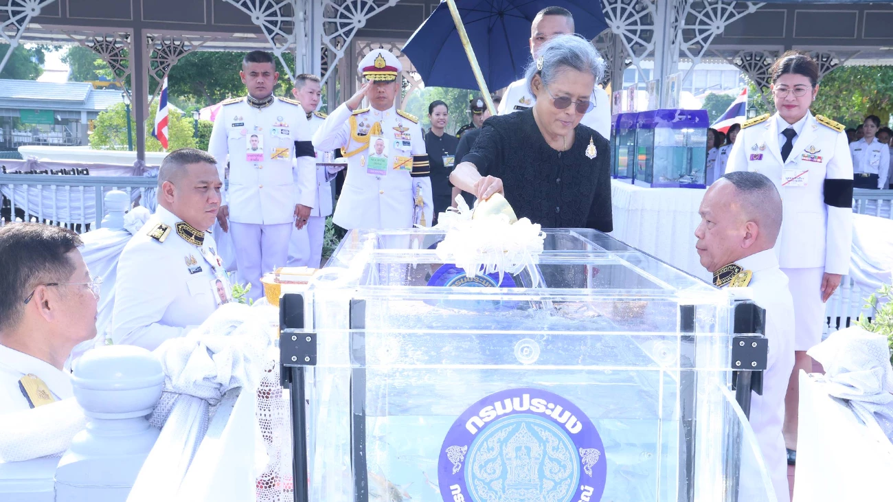 She also sprinkled holy water on the fish tank, cut the ceremonial ribbon and released 590,000 freshwater fish into the Chao Phraya River. The fish, provided by the Department of Fisheries, included silver barb, golden barb, Thai carp, black-banded trevally, white sardine, mud carp, Java barb, striped catfish and spiny eel.