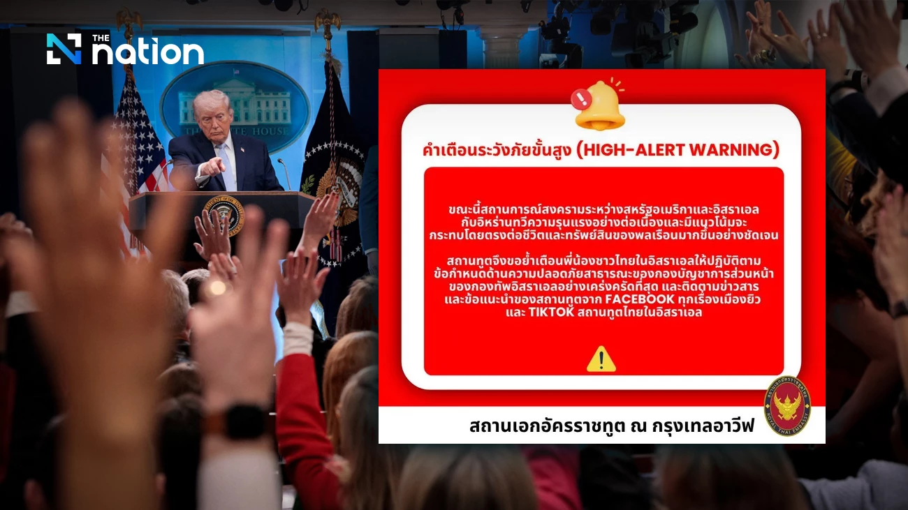 The Royal Thai Embassy in Tel Aviv has issued a high alert warning for Thai nationals in Israel, saying the war involving the United States and Israel on one side and Iran on the other is continuing to escalate and is increasingly likely to have a direct impact on civilian lives and property.
