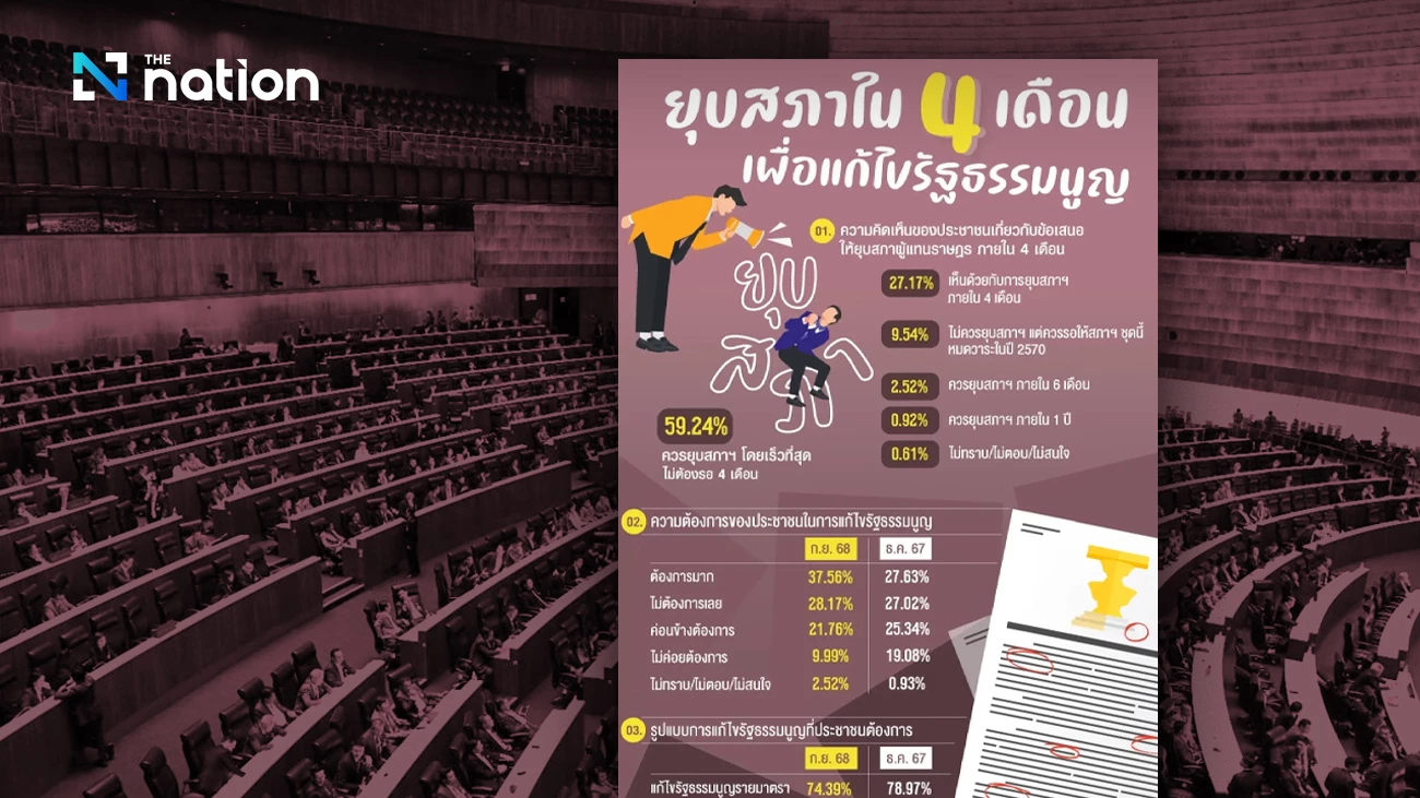 The survey, titled "House Dissolution in 4 Months for Constitutional Amendment," was conducted by the National Institute of Development Administration (Nida) Poll between 4-5 September 2025.