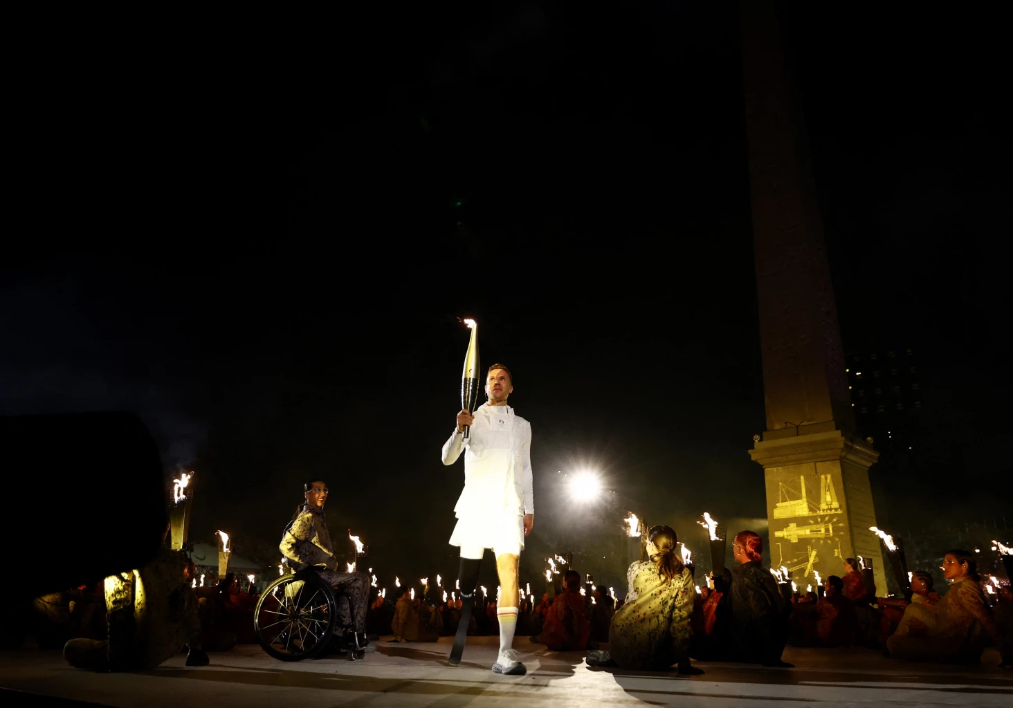 After a relay of the torch through the Jardin des Tuileries, the cauldron, 17 days after the Olympics ended, was lit again near the Louvre Museum by five French paralympic athletes -- Alexis Hanquinquant (triathlon), Nantenin Keita (athletics), Elodie Lorandi (swimming), Charles-Antoine Kouakou (athletics) and Fabien Lamirault (table tennis).