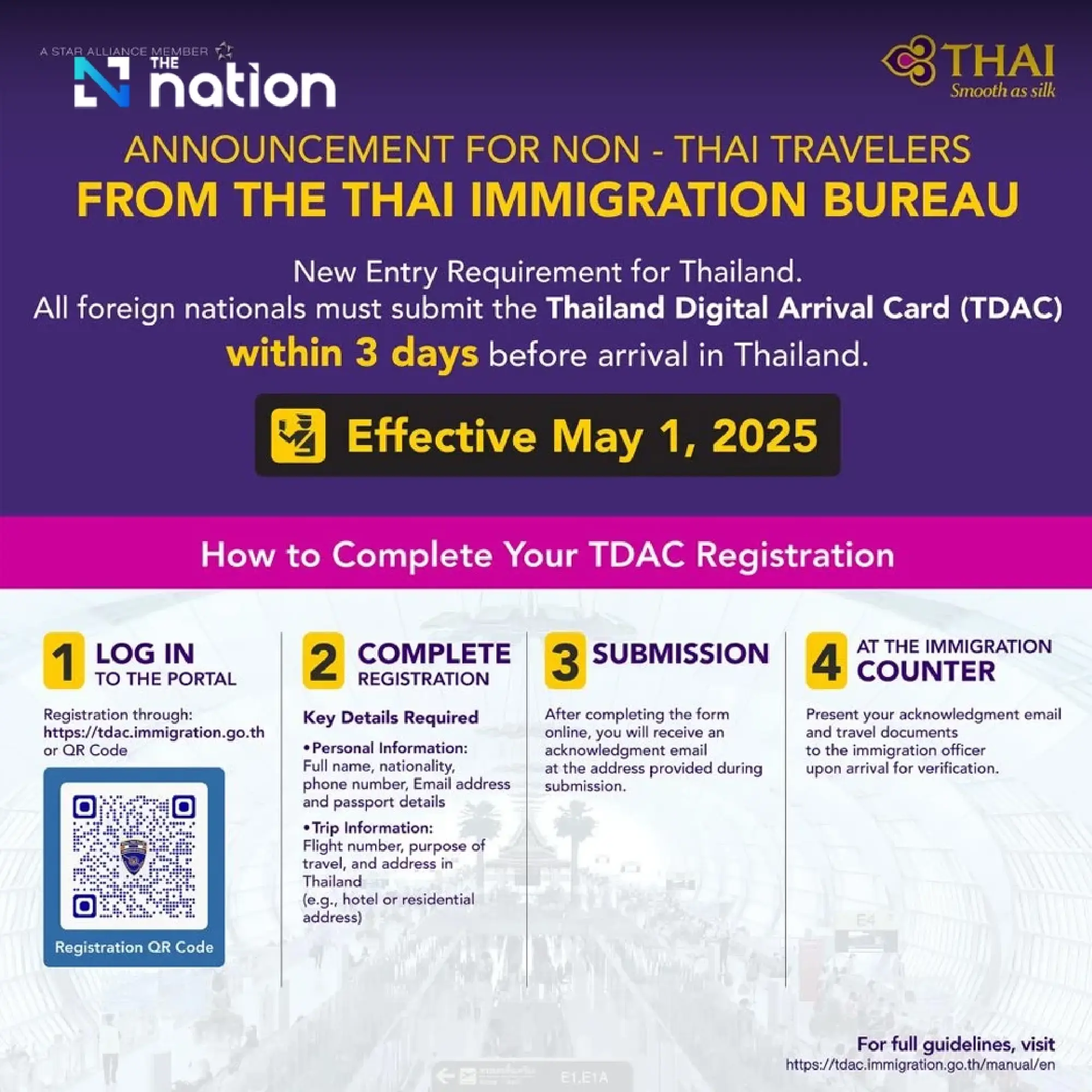 Travellers must register and complete the Thailand digital arrival card (TDAC) on the website tdac.immigration.go.th, he explained. While the platform is currently web-based, an application service is expected to be launched in the future.