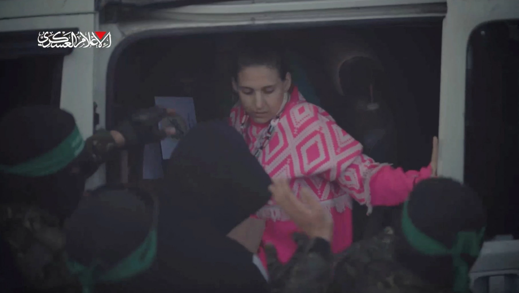 Footage showed the three women walking to Red Cross vehicles in Gaza City, surrounded by a crowd that swelled into the thousands as people held up cellphones and scrambled onto cars. The vehicles were accompanied by masked, armed men who wore green Hamas headbands and struggled to guard the handover.