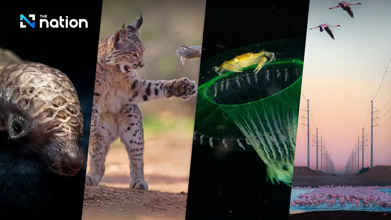 This year’s highlights include images that span a wide range of emotions — from the striking contrast of vivid flamingos set against high-voltage power lines, to a tiny crab hitching a ride on a jellyfish, and a tender moment of a baby sloth in its mother’s embrace.