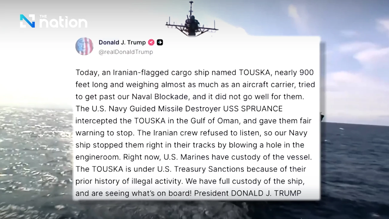 Trump identified the vessel as the TOUSKA, saying it had tried to break through the naval cordon in the Gulf of Oman before being stopped by the guided-missile destroyer USS Spruance, which allegedly disabled the ship by firing into its engine room.