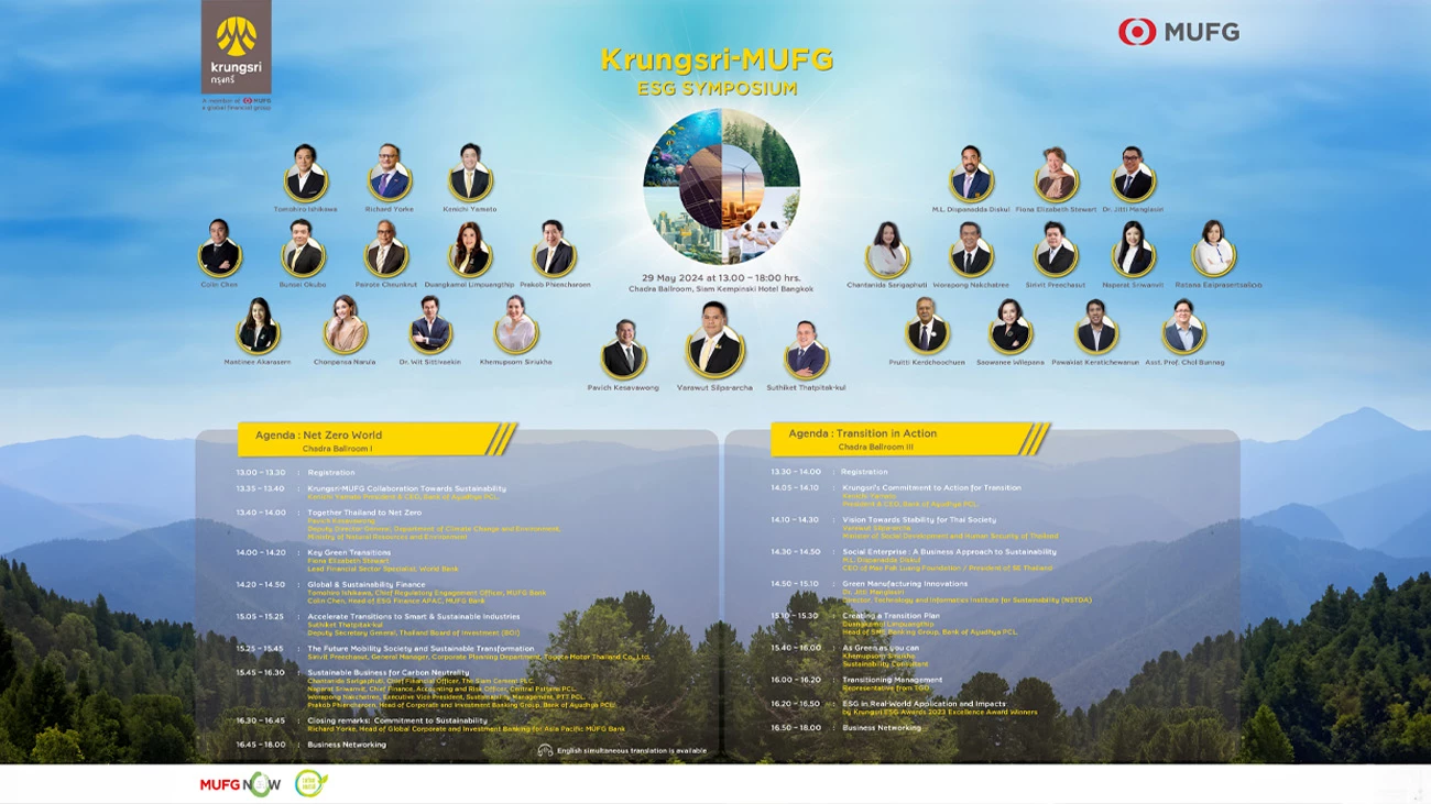 Krungsri - MUFG ESG Symposium 2024 reaffirms its commitment to carbon neutrality and sustainability support in accordance with ESG guidelines. Senior executives from leading business organizations and ESG experts from MUFG, Krungsri, and the World Bank, along with distinguished speakers from global arenas, share ESG knowledge with entrepreneurs to create a business transition plan to sustainability in accordance with the ESG framework and lead to long-term business transformation.