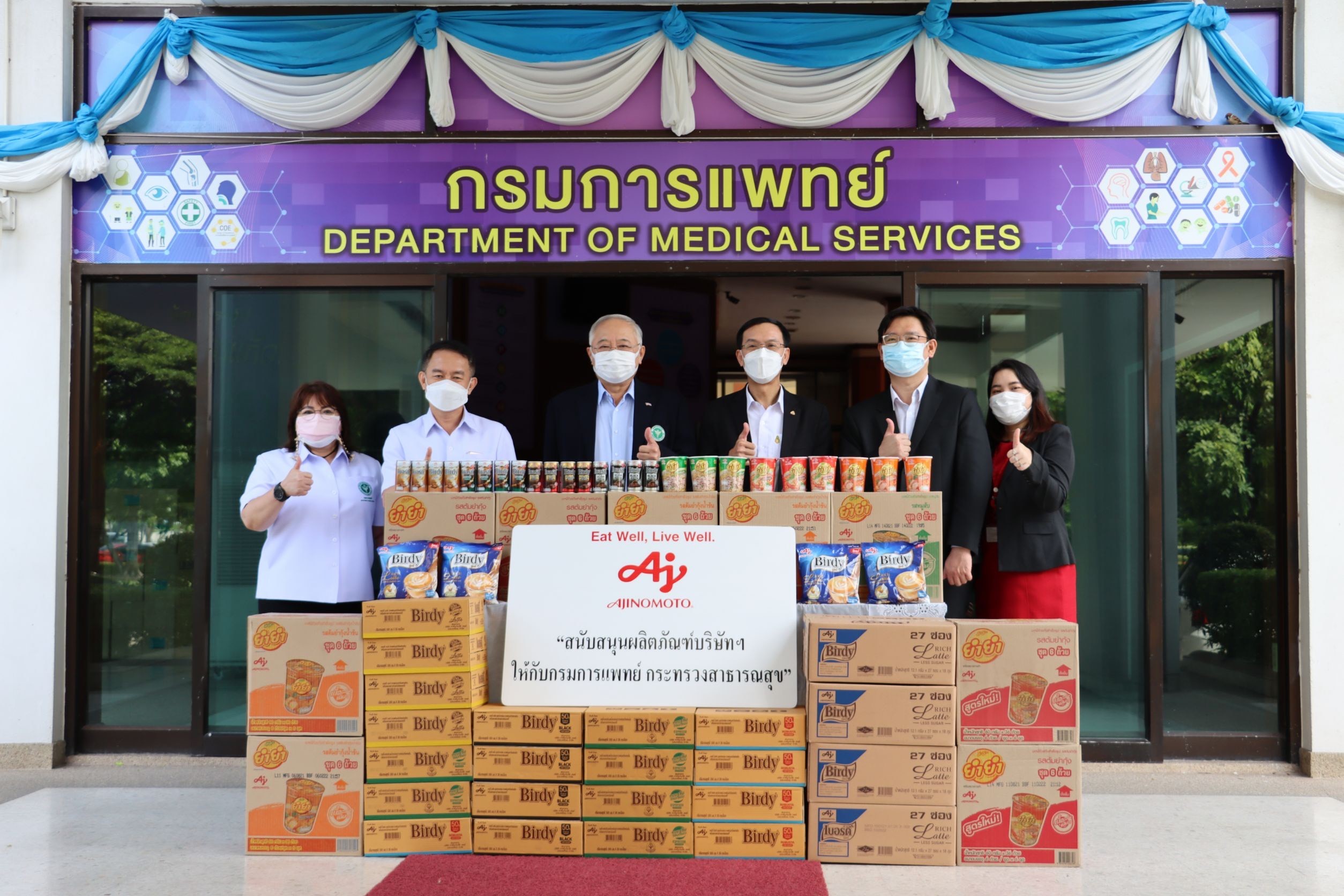 Recently, Ajinomoto Co., (Thailand) Ltd. led by Mr.Thongdee Paso (3rd from right), Managing Director, delivered company products including "Birdy®" RTD canned coffee, "Birdy® 3in1" instant coffee mixed powder and "YumYum™ Cup" instant noodles worth 40,000 Baht to Dr.Manus Potaporn (3rd from left), Deputy Director General of Department of Medical services, together with Dr.Pairoj Surattanawanich (2nd from left), Deputy Director General of Department of Medical services, and Mrs.Nitayaporn Thaweechaitanasakul (leftmost), Secretary to the Department of Medical services, in order to support the work of the Department as well as to encourage morale of all Healthcare workers who have worked hard during the COVID-19 epidemic situation.