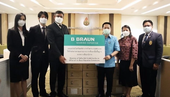Mr. Sayan Roy (3rd from left), Managing Director of B. Braun (Thailand) Co., Ltd., together with representatives from B. Braun Thailand CSR Club, jointly delivers 13,000 bottles of alcohol-based hand sanitizer “Softa-Gel” to Mr. Thoetchat Chaipong (3rd from right), Assistant Secretary-General of the Basic Education Commission, Ministry of Education. This is another activity from B. Braun that supports and protects Thai academic personnel and students from infection, and sustainably promotes health practices among the youth.