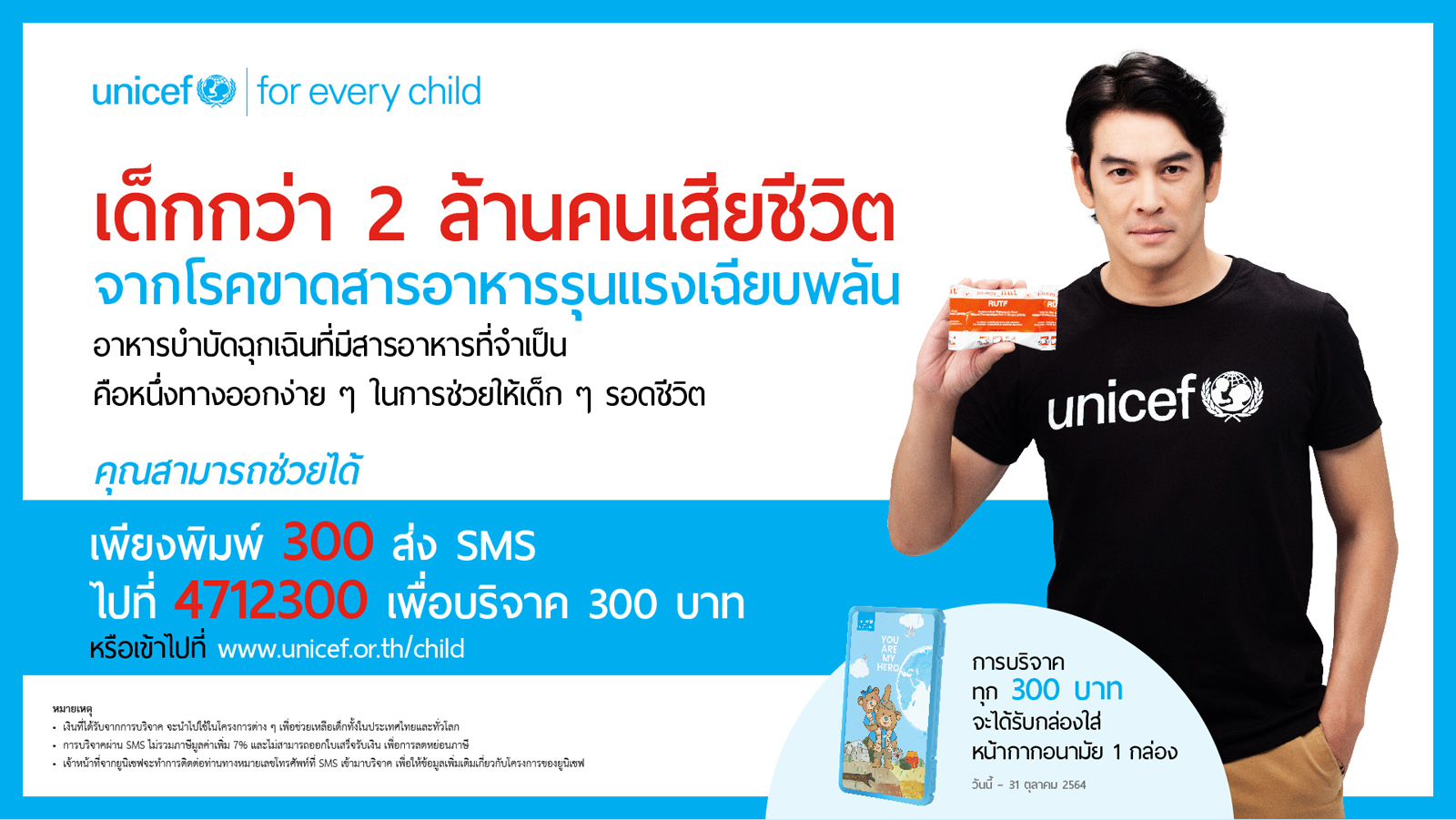 In a powerful video released on social media and local television channels, Shahkrit appeals to the Thai public to join UNICEF in saving children from dying from severe acute malnutrition. With every 300-baht donation, UNICEF is able to provide 24 sachets of ready-to-use therapeutic food to feed malnourished children. Donors will receive a face mask case for storage as a gift.