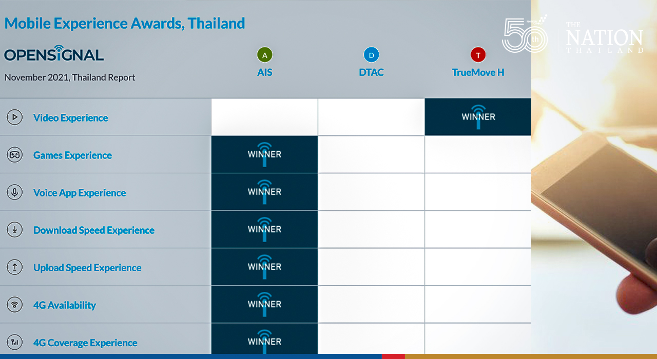 Opensignal unveils the ninth report of Thailand Mobile Network Experience Report Nov 2021 found that AIS dominates the awards table with six outright wins — the most it has ever gained in the history of our Thai reports. After impressive boosts in speeds, AIS snatched our two speed awards — Download Speed Experience and Upload Speed — away from the previous winner, TrueMove H. The operator also defended its crowns in the Games Experience, Voice App Experience, 4G Availability and 4G Coverage Experience categories. Video Experience is the only award AIS is missing for the clean sweep in Thailand, as TrueMove H keeps a firm grip of it.