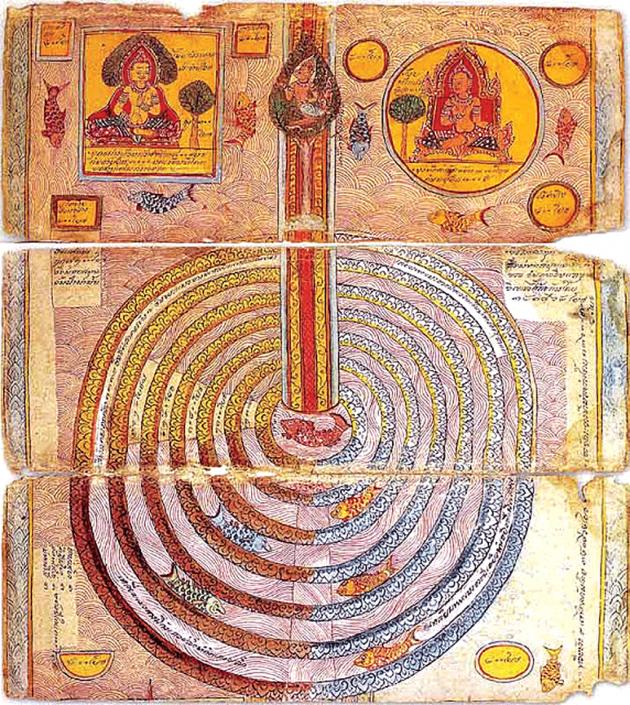 The centre of this sacred figure is the incarnation of unity around which the cosmic spheres organise themselves in concentric circles. Each sphere has a proportionate degree of happiness according to its proximity to the centre. The further from the centre, the more unhappy and sinful is the life.