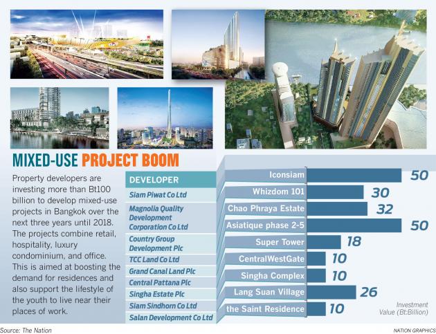 According to a survey by The Nation, nine property developers have unveiled plans to develop mixed-use projects between 2015 and 2018. The mixed-use projects combine offices, condominiums, retail and hotel. They serve the demand of the new generation to have office and living area at the same location, while retail outlets and hotels will serve their lifestyle needs.