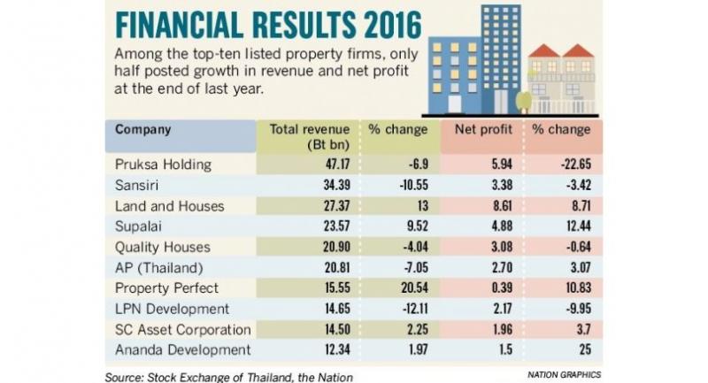 They were Land and Houses, Supalai, Property Perfect, SC Asset Corporation, and Ananda Development. Four of them, Pruksa Holding, Sansiri, Quality Houses and LPN Development, reported declines in revenue and net profit. AP (Thailand) reported lower revenue but still managed higher net profit than in 2015 (see graphic).
