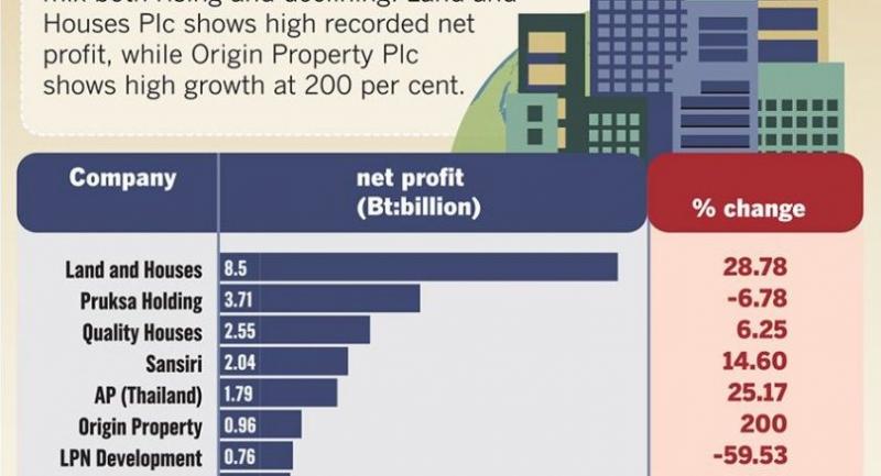 Topping the financial results among listed property first at the end of the third quarter is Land and Houses Plc, with a high net profit Bt8.5 billion, up 28.78 per cent from the same period of last year. Using another yardstick, Origin Property Plc reported net profit of Bt966.74 million for the first nine months of this year, up 200 per cent from the