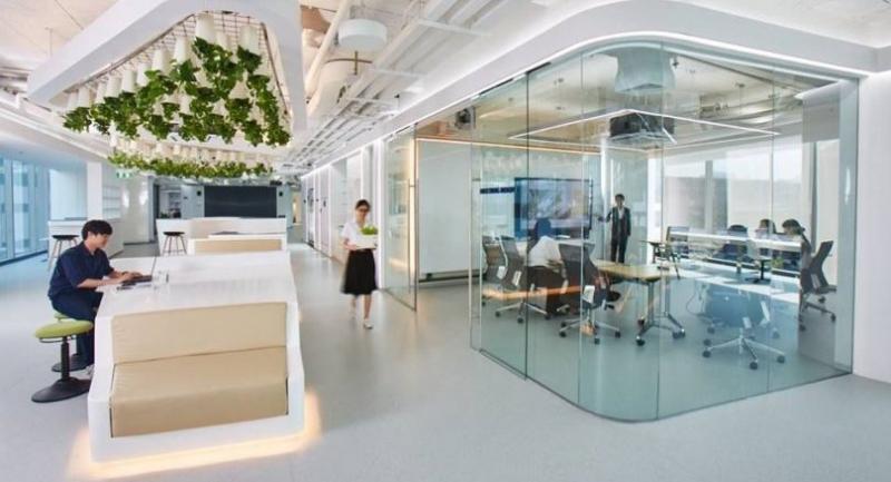 Smart curtain is run on an app while the smart lighting system is controlled through electronic switches assigned to sub-areas. Automatic switching circuits in locations exposed to natural light enable responsive control. Lighting in the office and working zones is controlled through daylight sensors, which switches on additional lights as needed to raise work efficiency.