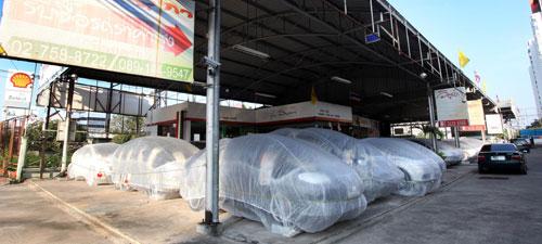 There are also large plastic bags which are sold for Bt3,000 and have become very popular. You simply drive your car into this large bag, come out and then tighten the ends.