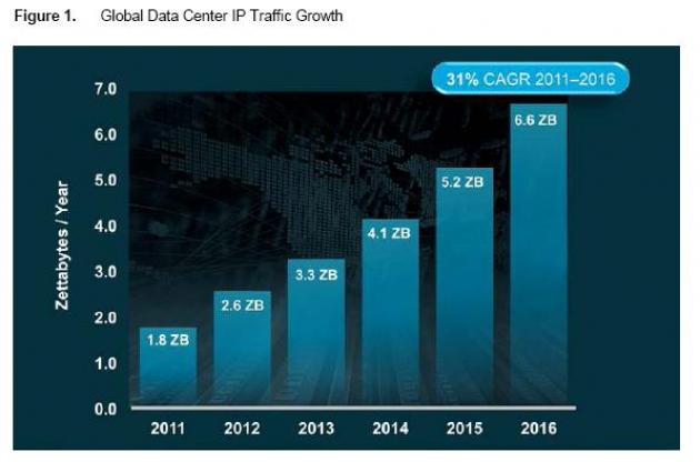 Cisco forecasts global data center traffic to grow fourfold and reach a total of 6.6 zettabytes annually by 2016.