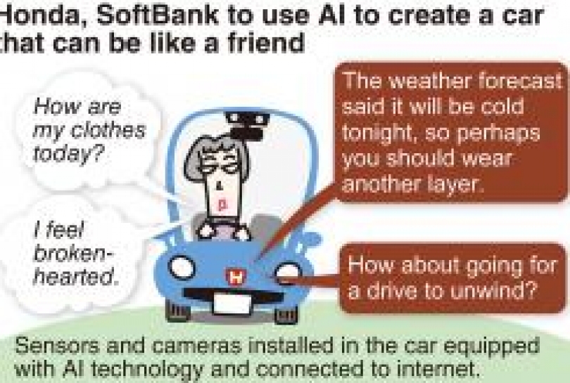 Honda aims to equip its cars with an “emotion engine,” a piece of AI technology developed by a company under the SoftBank umbrella. The engine will be a practical application of AI that can “read” a person’s emotions and hold a conversation with them and express its own feelings.