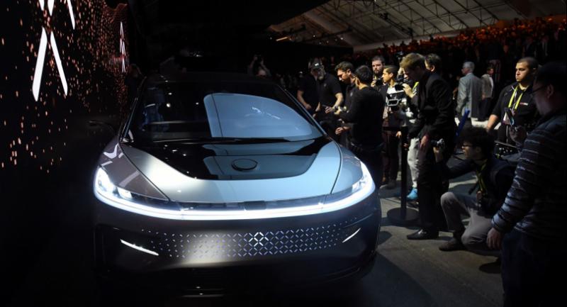 Faraday Future Senior Vice President of Research and Development and Engineering Nick Sampson unveils Faraday Future's FF 91 prototype electric crossover vehicle during a press event for CES 2017 at The Pavilions at Las Vegas Market on January 3, 2017 in Las Vegas, Nevada. The 1,050-horsepower FF 91 features autonomous driving with 3D lidar and can go from 0 to 60 mph in 2.39 seconds. /AFP