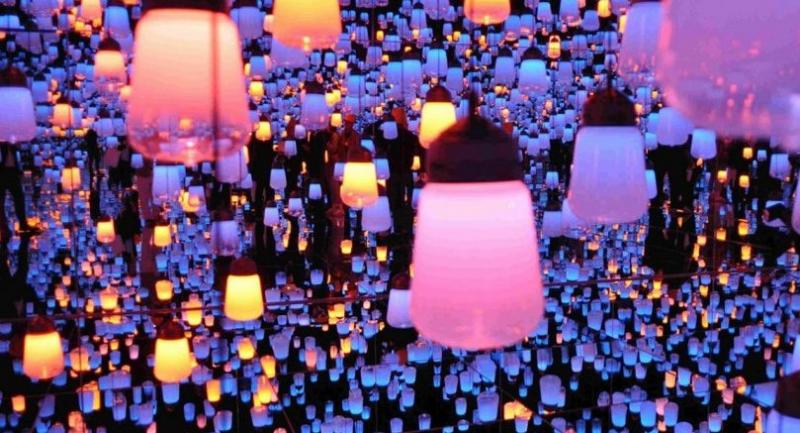 The lamps shine brightly when visitors approach, causing other lamps nearby to illuminate with the same color. Titled “Forest of Resonating Lamps — One Stroke,” the exhibit is the work of teamLab Inc., a Tokyo-based group of about 400 artists and scientists.