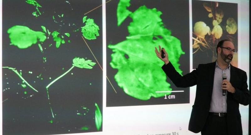 After his success in making a watercress shoot glow as a prototype for a living desk lamp, the professor and the centre will work together to research and develop trees that can operate as self-powered streetlights.