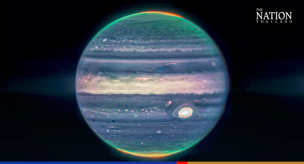 In the standalone view of Jupiter, created from a composite of several images from Webb, auroras extend to high altitudes above both the northern and southern poles of Jupiter.
