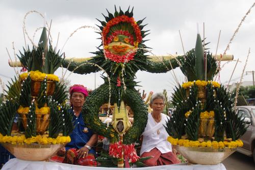 What I find is a small town springing to life with dances of joy and throngs of beautiful floral floats. The local people, dressed in their unique tribal costumes, carry baskets full of roasted chicken, barbecued fish, fried meats, mainly pork, vegetables, cigarettes and jars of rice wine before gathering at the public park in front of the town hall. Apparently, this impressive feast should make the hungry ghosts happy for a few days.