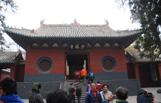 After the wushu show, visitors are herded through an elevated “mountain gate”, reached by a flight of 16 broad stone stairs. Under the curved tile roof hangs an elegant gold leaf inscription with the three Chinese characters for Shaolin Temple, written in the 18th century by the Qing Dynasty’s Kangxi emperor.