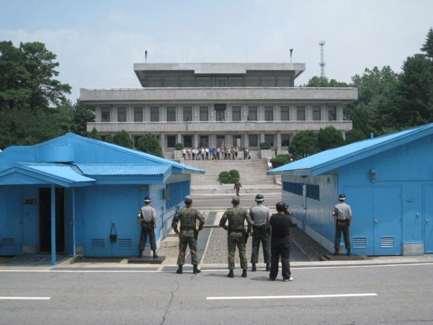 The instantly recognisable blue buildings in the JSA, along with South Korean soldiers standing in a tae-kwondo position facing their North Korean counterparts, seem surreal in the bright sunshine. The military demarcation line, which cuts the blue buildings and even the negotiating table in half, dramatise the tension even more. Waving or pointing at the North Korean side is strictly forbidden.