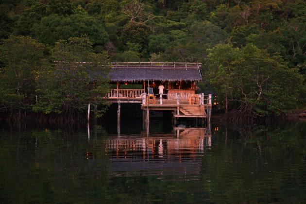 One rainy evening just as the sky is getting dark, the speedboat sweeps from down to upstream before negotiating a small mosquito-infested canal edged by a thick wall of mangrove. I keep looking for the restaurant, but there is no hint of it in sight.