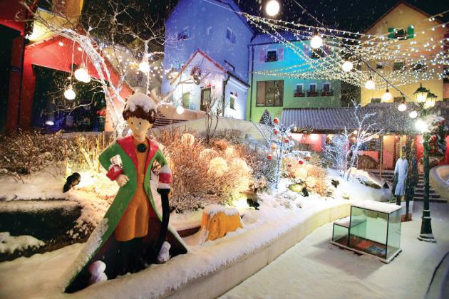 Petite France, a French concept cultural village located in Gapyeong-gun, Gyeonggi-do, is hosting a special night event, ‘Le Petit Prince Star Light Festival’. Following the theme of the original book, “The Little Prince”, the village is toned with pastel colours, illuminated with thousands of lights and decorated with cute little ornaments, recreating the prince’s living planet. The Little Prince along with Christmas and sculptures create a fairyland for both children and adults.