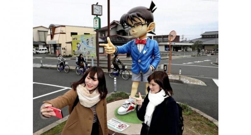 A fan strikes the same pose as Detective Conan while taking a photo with a statue of him in front of JR Yura Station in Hokuei, Tottori Prefecture.(Photo/The Yomiuri Shimbun)