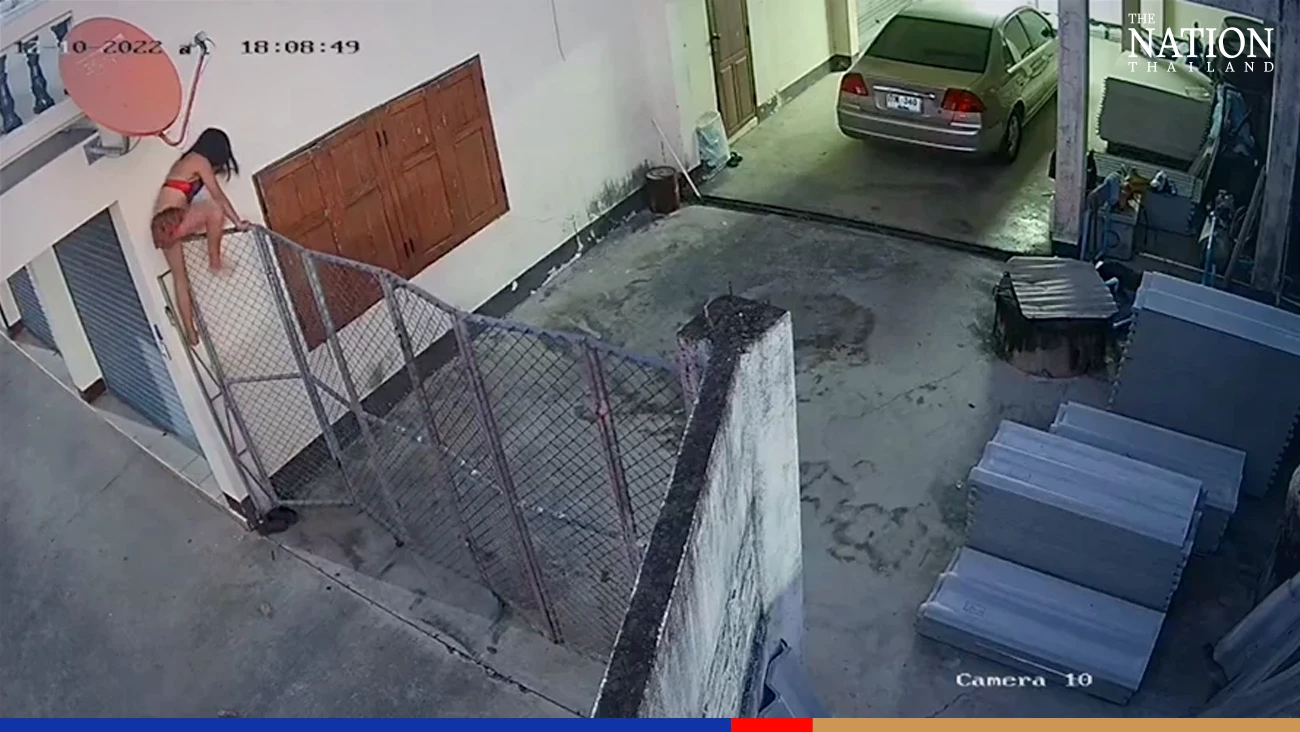 The clip shows the scantily clad intruder climbing over a chain-link fence into the compound at the back of the shop at about 6pm Monday.