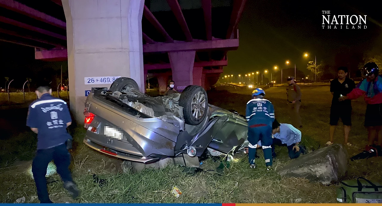 Investigators say the car was on the expressway at the Sukhapiban 5 side heading towards Rama IX Road. The car then reportedly swerved and drove against the traffic for about 3 kilometres before crashing into a temporary barrier and falling off the expressway.