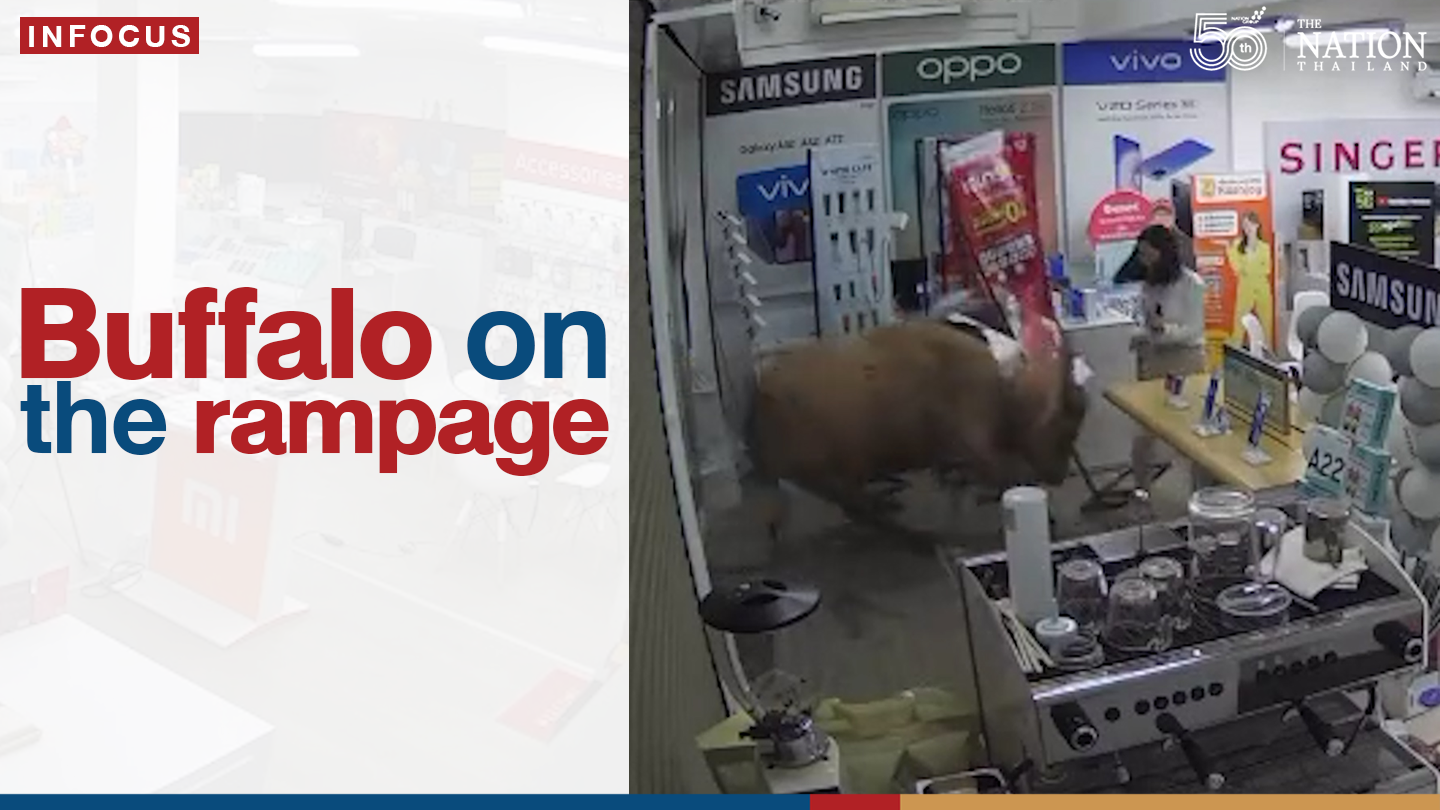 An albino buffalo escaped from a Chiang Mai rice field and darted into a nearby gas station store, knocking a shocked attendant to the ground.