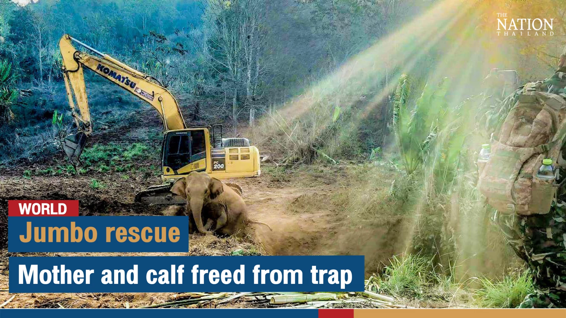 An elephant and her calf were rescued after becoming trapped in a deep hole in Kanchanaburi province on Monday.